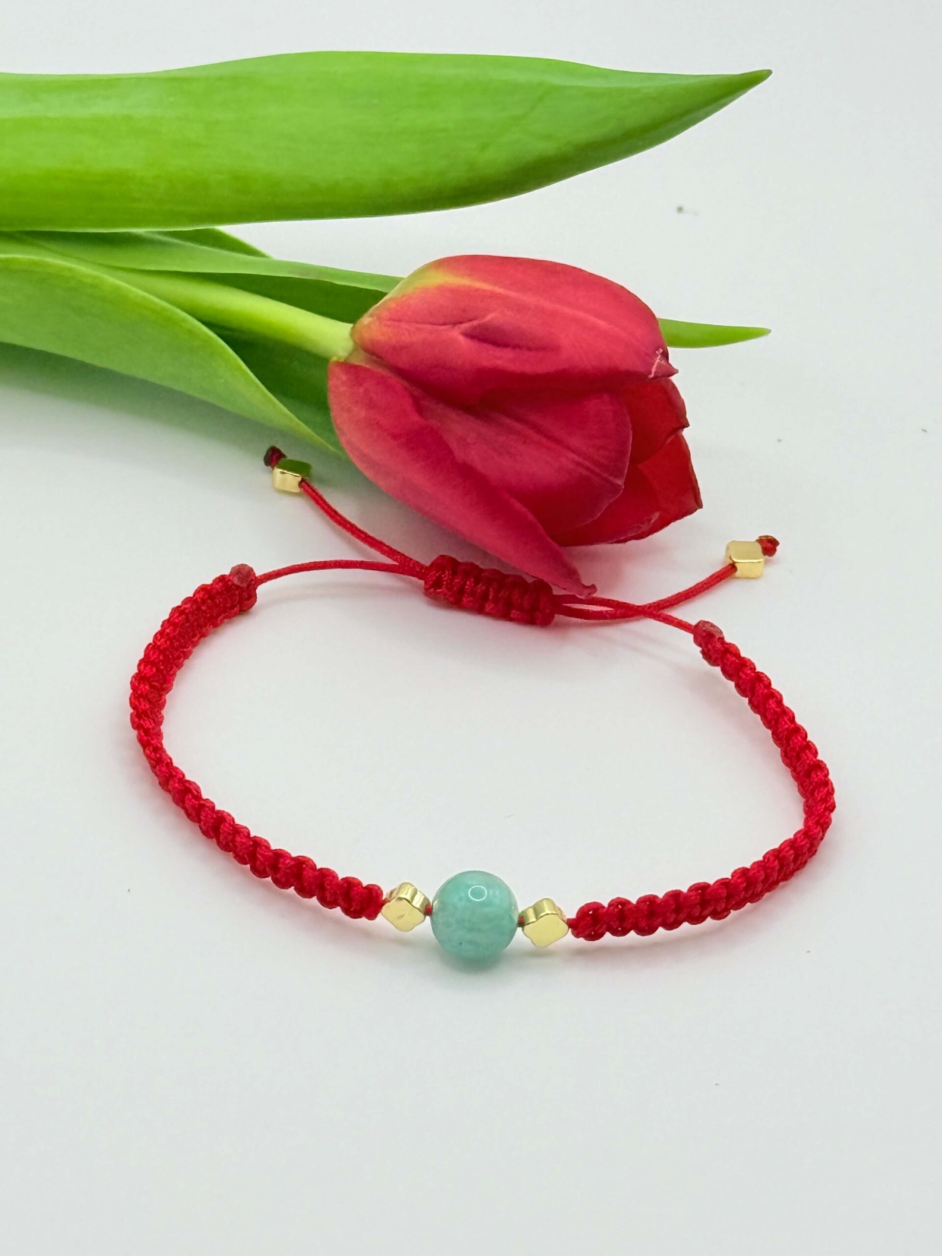 Bransoletka pleciona z kamieniami naturalnymi na czerwonym sznurku.