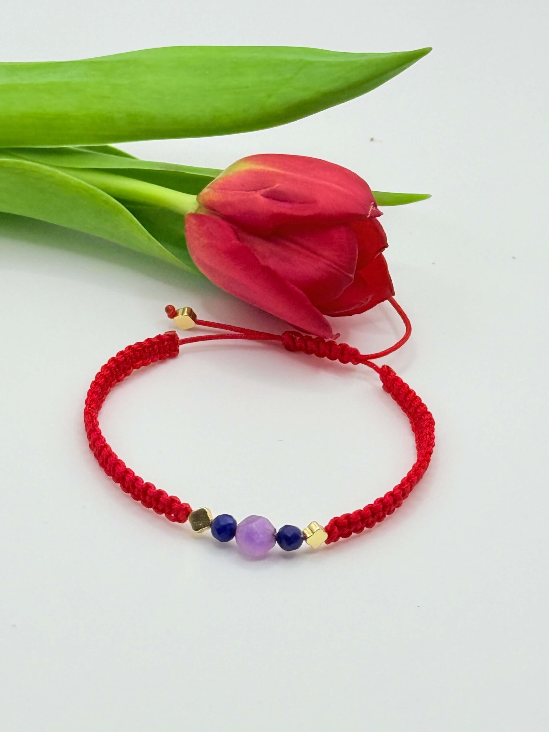 Bransoletka pleciona z kamieniami naturalnymi na czerwonym sznurku.